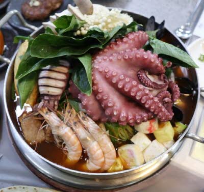 갈비 + 문어 + 떡갈비 + 샐러드 + 고르곤졸라피자 + 홍합 + 새우 + 오징어 + 낙지 + 버섯 + 어묵 등등