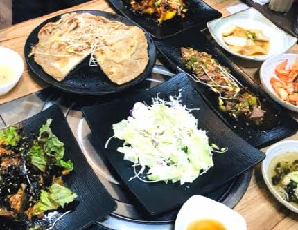 죽 + 단호박튀김샐러드 + 도토리묵사발 + 메밀전 + 콩묵무침 + 돼지불고기 + 녹두닭 + 가지탕수 + 회 or 회무침 +