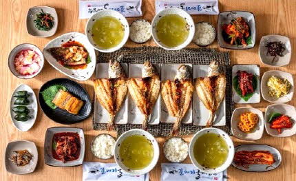 영광굴비구이 + 보리굴비 + 고추장굴비 + 간장게장 + 양념게장 + 떡갈비 + 홍어무침 + 홍어찜 + 매운탕 + 모시송편