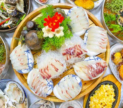 백합구이 + 백합탕 + 백합죽 + 초무침(조개 or 갑오징어) + 생선구이 + 해산물
